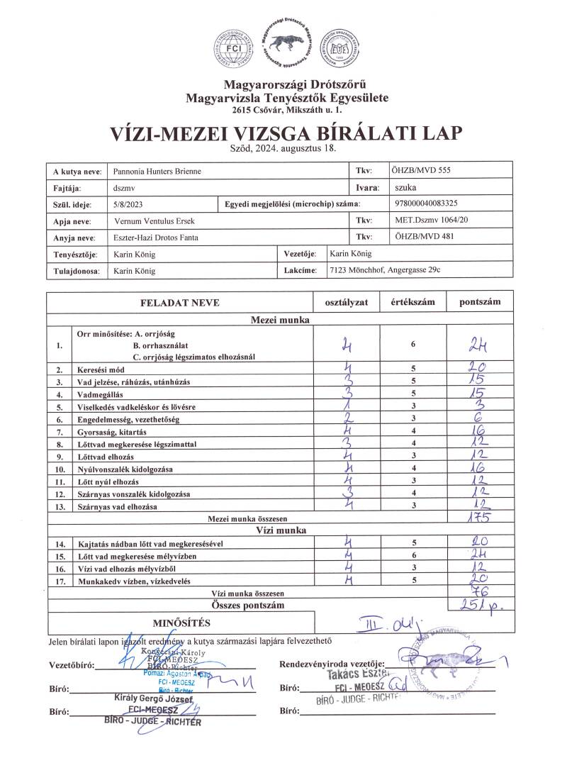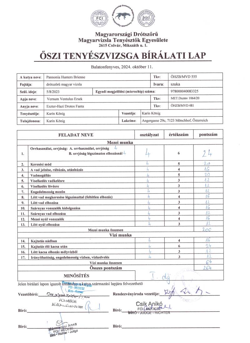 Pannonia Hunter Brienne "Birdy" hat heute beim ungarischen Drahthaar-Vizsla Verband (Magyarországi Drótszörü Magyarvizsla Tenyésztök Egyesülete) die ÖTV (Öszi Tenyészvizsga), die Feld- und Wasserprüfung mit lebender Ente, mit vollen Punkten im