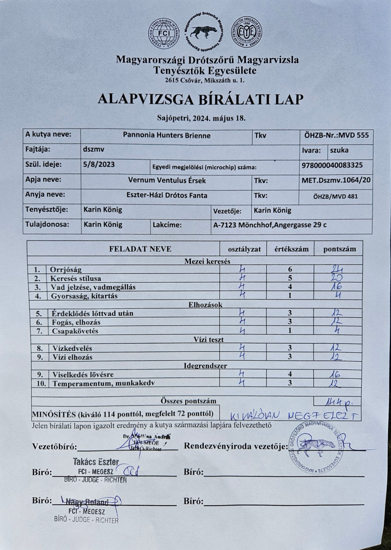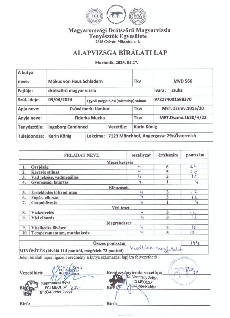 Mokus von Haus Schladern hat heute beim ungarischen Drahthaar-Vizsla Verband (Magyarországi Drótszörü Magyarvizsla Tenyésztök Egyesülete) die Anlagenprüfung (Alapvizga) mit vollen Punkten bestanden.